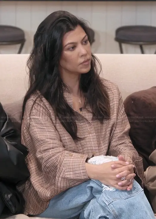 Kourtney Kardashian (played by Kourtney Kardashian) on The Kardashians on Hulu was spotted wearing this brown check print top on The Kardashians on episode 'If It Doesn’t Fit, We Must Acquit' (7x06) in Nov 2025. Kourtney's Top is the Checked bow-neck top by Munthe.