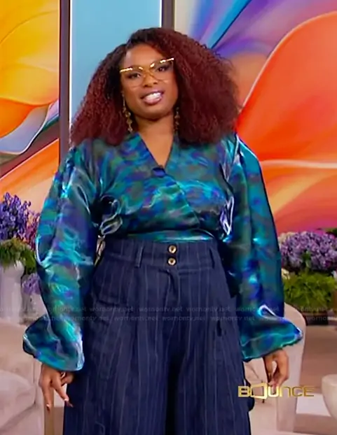 Jennifer Hudson on The Jennifer Hudson Show on FOX was spotted wearing this blue abstract satin wrap top on The Jennifer Hudson Show on Nov 11 2025's episode. Jennifer's Top is the Sasha Top by Olarsgrace.