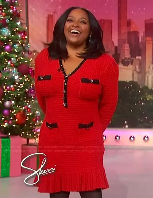 Sherri Shepherd on Sherri on FOX was spotted wearing this red tweed mini dress on Sherri on Dec 01 2025's episode. Sherri's Dress is the Crystal-embellished waffle-knit minidress by Self Portrait.