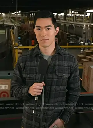 on Today on NBC was spotted wearing this grey plaid button down shirt on Today on Dec 01 2025's episode. 's Shirt is the The Japanese Low Twist Shirt in Charcoal Plaid by Proper Cloth.
