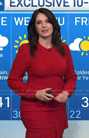 Maria Larosa on Today on NBC was spotted wearing this red ruffle hem dress on Today on Dec 01 2025's episode. Maria L's Dress is the Ruched Bodycon Mini Dress in red by PrettyGarden.