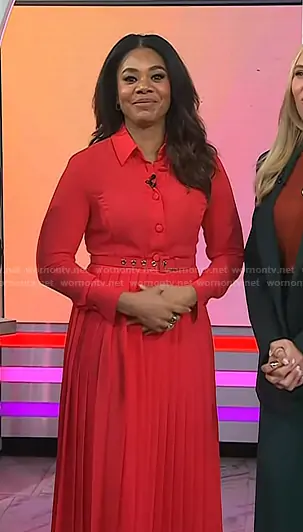 on Today on NBC was spotted wearing this red belted pleated dress on Today on Dec 01 2025's episode. 's Dress is the Pleated Crepe Dress by Monique Lhuillier.