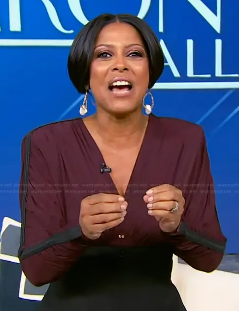 Tamron Hall on Tamron Hall Show on ABC was spotted wearing this burgundy bodysuit on Tamron Hall Show on Dec 01 2025's episode. Tamron's Bodysuit is the V-neck long-sleeve bodysuit by Elisabetta Franchi.