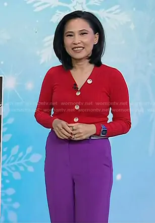 Vicky Nguyen on Today on NBC was spotted wearing this red cardigan and purple flare pants on Today on Dec 02 2025's episode. Vicky's Sweater is the Gabrielle Ribbed Knit Cardigan by Sandro . Vicky's Pants is the Fluid Flare Trousers by Reiss.