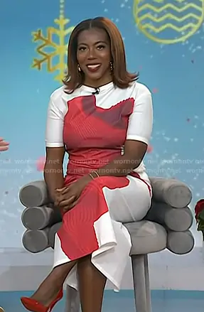 on Today on NBC was spotted wearing this white and red print top and skirt on Today on Dec 02 2025's episode. 's Top is the Knit As Represented Short-Sleeve Top by Issey Miyake . 's Skirt is the Knit As Represented Column Maxi Skirt by Issey Miyake .