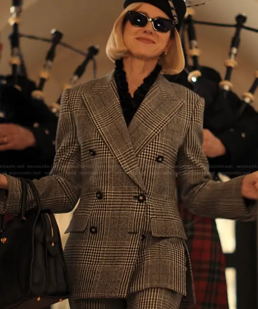 Liberty Ronson (played by Naomi Watts) on Alls Fair on Hulu was spotted wearing this gray plaid blazer and pants on Alls Fair on episode 'Letting Go' (1x07) in Dec 2025. Liberty's Blazer is the Glen-plaid double-breasted blazer by Dolce & Gabbana . Liberty's Pants is the Plaid-pattern flared trousers by Dolce & Gabbana.