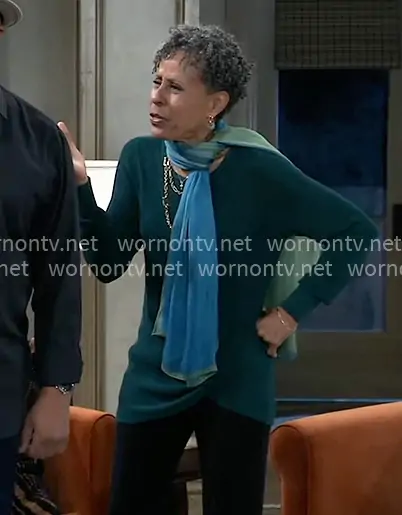 Stella Henry (played by Vernee Watson) on General Hospital on ABC was spotted wearing this teal twist-hem sweater on General Hospital on Dec 02 2025's episode. Stella's Sweater is the Twist Front Knit by Chicos .