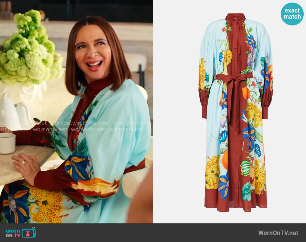 Molly Novak (played by Maya Rudolph) on Loot on Apple was spotted wearing this blue tropical print dress on Loot on episode 'Slide' (3x09) in Dec 2025. Molly's Dress is the Dahlia cotton and silk shirt dress by Alemais.