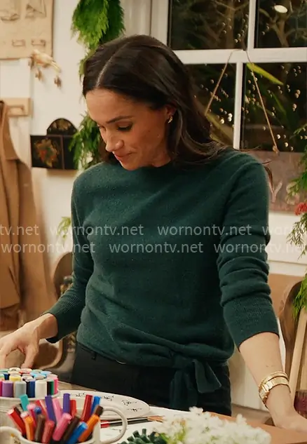 Meghan Markle on With Love Meghan on Netflix was spotted wearing this green tie-hem sweater on With Love Meghan on episode 'Holiday Celebration' (2x09) in Dec 2025. Meghan's Sweater is the Nalini Sweater by Altuzarra .