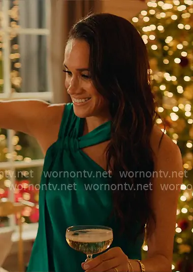 Meghan Markle on With Love Meghan on Netflix was spotted wearing this green satin dress on With Love Meghan on episode 'Holiday Celebration' (2x09) in Dec 2025. Meghan's Dress is the Ushuaia Dress in Emerald by Galvan .