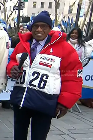 on Today on NBC was spotted wearing this red, white and navy puffer jacket on Today on Feb 19 2026's episode. 's Jacket is the Team USA Closing Ceremony Jacket in RL Red Multi by Polo Ralph Lauren . 's Hat is the Team USA Closing Ceremony Beanie by Polo Ralph Lauren.