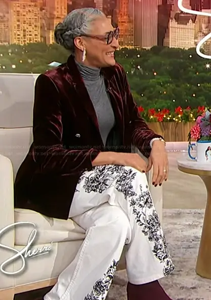 on Sherri on FOX was spotted wearing this burgundy velvet blazer and floral pants on Sherri on Dec 03 2025's episode. 's Blazer is the Gaya Dickey Jacket by Veronica Beard . 's Pants is the High Rise Embroidered Wide Leg Jeans in Off White Black by Alice + Olivia.