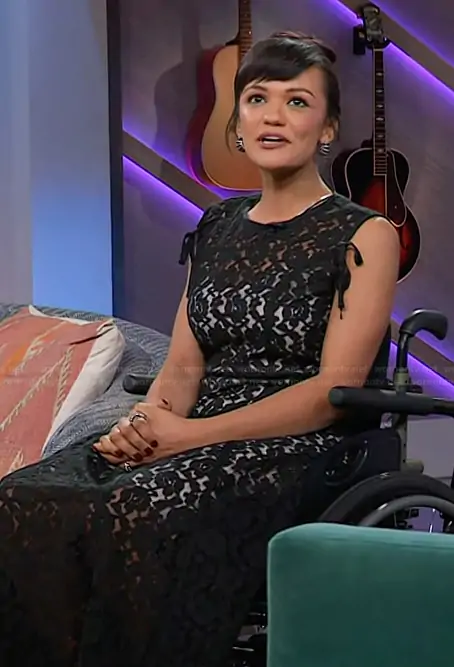on The Kelly Clarkson Show on NBC was spotted wearing this black lace dress on The Kelly Clarkson Show on Dec 04 2025's episode. 's Dress is the Audrey Sleeveless Lace Midi Dress by Lovaan.
