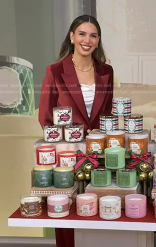 on Good Morning America on ABC was spotted wearing this red velvet blazer on Good Morning America on Dec 05 2025's episode. 's Jacket is the Silas Velvet Blazer in Oxblood by Alice + Olivia . 's Pants is the Kennedy Double Pleat Pants in Oxblood by Alice + Olivia.