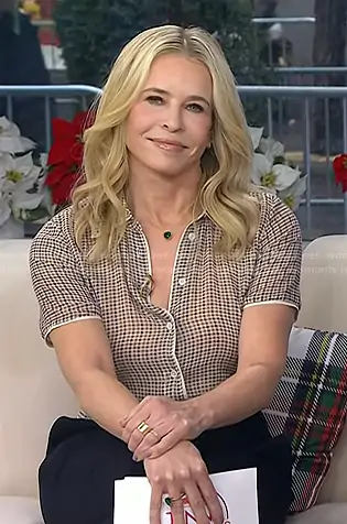 on Today on NBC was spotted wearing this plaid short sleeve shirt on Today on Dec 05 2025's episode. 's Top is the The Houndstooth Silk Short Sleeve Button-Up Shirt by Frame.