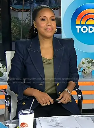 Sheinelle Jones on Today on NBC was spotted wearing this denim jacket with gold buttons on Today on Dec 05 2025's episode. Sheinelle's Jacket is the Anoki Dickey Denim Jacket by Veronica Beard.