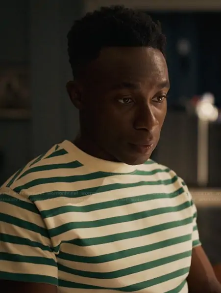 Carlton Banks (played by Olly Sholotan) on Bel-Air on Peacock was spotted wearing this green stripe tee on Bel-Air on episode 'Your Crown Is Waiting' (4x06) in Dec 2025. Carlton's Shirt is the Heavyweight Stripe T-shirt by Brain Dead.