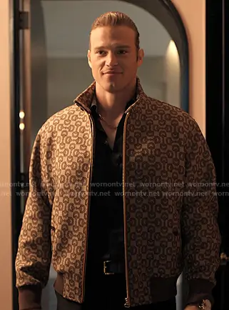 Chase Munroe (played by Matthew Noszka) on Alls Fair on Hulu was spotted wearing this brown horsebit print jacket on Alls Fair on episode 'Oh, Jesus!' (1x08) in Dec 2025. 's Jacket is the Horsebit Jacquard Wool Jacket by Gucci.