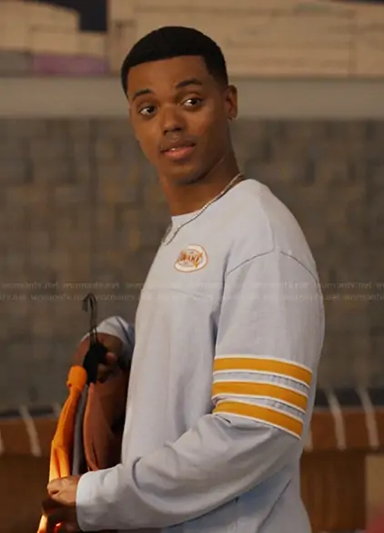 Will Smith (played by Jabari Banks) on Bel-Air on Peacock was spotted wearing this blue sleeve stripe sweatshirt on Bel-Air on episode 'The Next Act' (4x08) in Dec 2025. Will's Shirt is the Varsity Striped Cotton-Jersey T-Shirt by Awake NY.