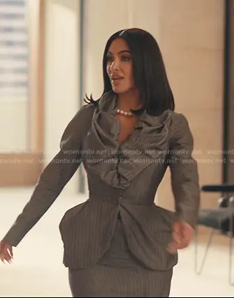 Allura Grant (played by Kim Kardashian) on Alls Fair on Hulu was spotted wearing this grey pinstripe ruffle collar jacket on Alls Fair on episode 'Oh, Jesus!' (1x08) in Dec 2025. Allura's Set is the Red Label Pinstripe Ruched Skirt Suit by Vivienne Westwood . Allura's Tights is the Lace Cut Out Fishnet Tights by Natori . Allura's Shoes is the Satin Pumps in Yellow by Nina Ricci.