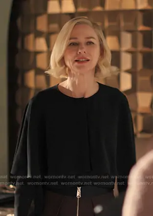 Liberty Ronson (played by Naomi Watts) on Alls Fair on Hulu was spotted wearing this black cape blouse on Alls Fair on episode 'Interior Law Offices' (1x09) in Dec 2025. Liberty's Top is the Cape Blouse in Georgette black by Chloe . Liberty's Pants is the Marine Wide-leg Pants by Khaite.