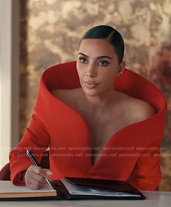 Allura Grant (played by Kim Kardashian) on Alls Fair on Hulu was spotted wearing this red stand collar dress on Alls Fair on episode 'Interior Law Offices' (1x09) in Dec 2025. Allura's Dress is the 52nd Collection by Balenciaga.