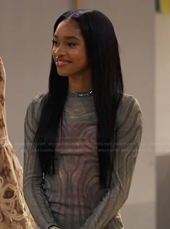 Ashley Banks (played by Akira Akbar) on Bel-Air on Peacock was spotted wearing this swirl print mesh top on Bel-Air on episode 'The Next Act' (4x08) in Dec 2025. Ashley's Top is the Spiral Print Mesh Top by Jean Paul Gaultier.