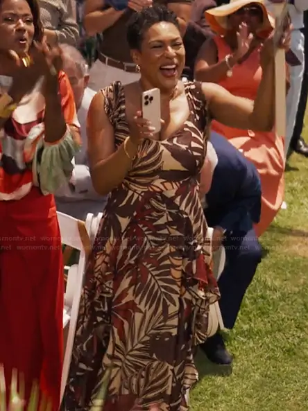 Aunty Vy (played by April Parker Jones) on Bel-Air on Peacock was spotted wearing this floral print asymmetric dress on Bel-Air on episode 'The Next Act' (4x08) in Dec 2025. 's Dress is the Sleeveless Chiffon A-Line Dress by Siena.
