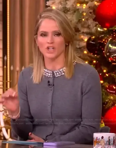 Sara Haines on The View on ABC was spotted wearing this gray embellished cardigan on The View on Dec 09 2025's episode. Sara's Sweater is the Daro Embellished Merino Wool Cardigan by Veronica Beard.