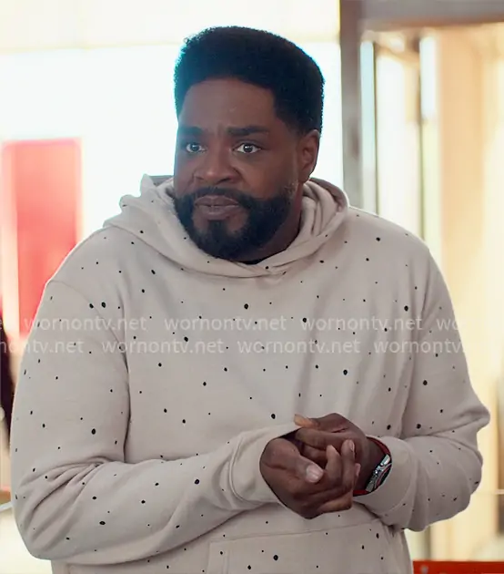 Howard (played by Ron Funches) on Loot on Apple was spotted wearing this blush pink splatter print hoodie on Loot on episode 'Hail Mary Time' (3x10) in Dec 2025. Howard's Sweatshirt is the Hooded Sweatshirt by Goodfellow & Co at Target.