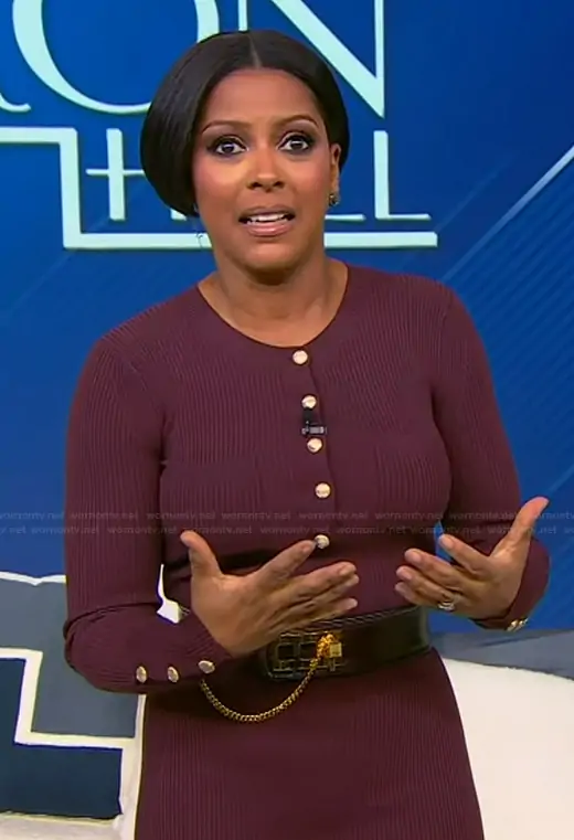 Reiss Willow Buttoned Rib-Knit Midi Dress in Burgundy worn by Tamron Hall on Tamron Hall Show