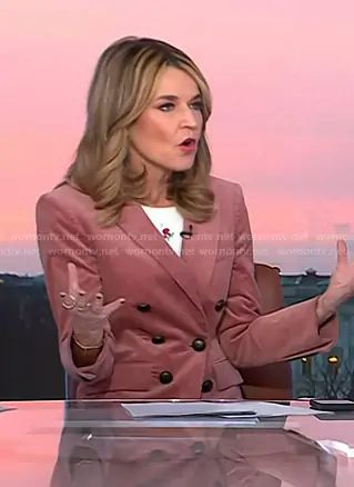 Savannah Guthrie on Today on NBC was spotted wearing this white floral tee and pink corduroy blazer on Today on Dec 10 2025's episode. Savannah's Top is the Fleur T-shirt by Rouje X J.Crew . Savannah's Jacket is the Lawrence Stretch Cotton Corduroy Dickey Jacket by Veronica Beard.