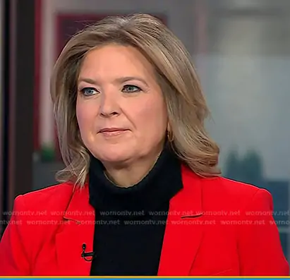 Christine Romans on Today on NBC was spotted wearing this Christine’s red blazer and pants on Today on Dec 10 2025's episode. Christine's Jacket is the Khloe Ruched Sleeve Blazer in Candy Apple by Cinq a Sept . Christine's Pants is the Kerry Pant in Candy Apple by Cinq a Sept.