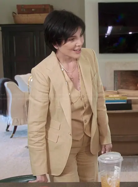 Kris Jenner (played by Kris Jenner) on The Kardashians on Hulu was spotted wearing this beige vest and blazer on The Kardashians on episode 'Stay The F*** Away From Me' (7x08) in Dec 2025. Kris's Vest is the Jaden Rustic Twill Vest by Ralph Lauren . Kris's Blazer is the Russel Twill Blazer by Ralph Lauren . Kris's Pants is the Dean Rustic Twill Trousers by Ralph Lauren.
