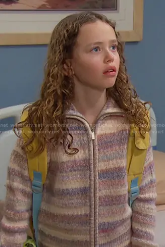 Rachel Black (played by Alice Halsey) on Days of our Lives on Peacock was spotted wearing this pink striped zip cardigan on Days of our Lives on Dec 11 2025's episode. 's Sweater is the Kids' Stripe Zip-Up Cardigan by Next . 's Shoes is the Kids' Chuck Taylor® All Star® 1V High Top Sneaker by Converse.