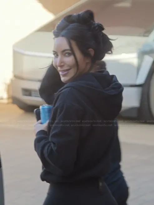 Kim Kardashian (played by Kim Kardashian) on The Kardashians on Hulu was spotted wearing this black hoodie on The Kardashians on episode 'Stay The F*** Away From Me' (7x08) in Dec 2025. Kim's Sweater is the Boxy Zip Hoodie by Skims.