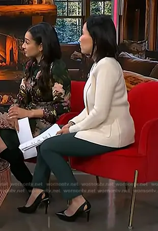 Vicky’s white collared short sleeve cardigan on NBC News Daily