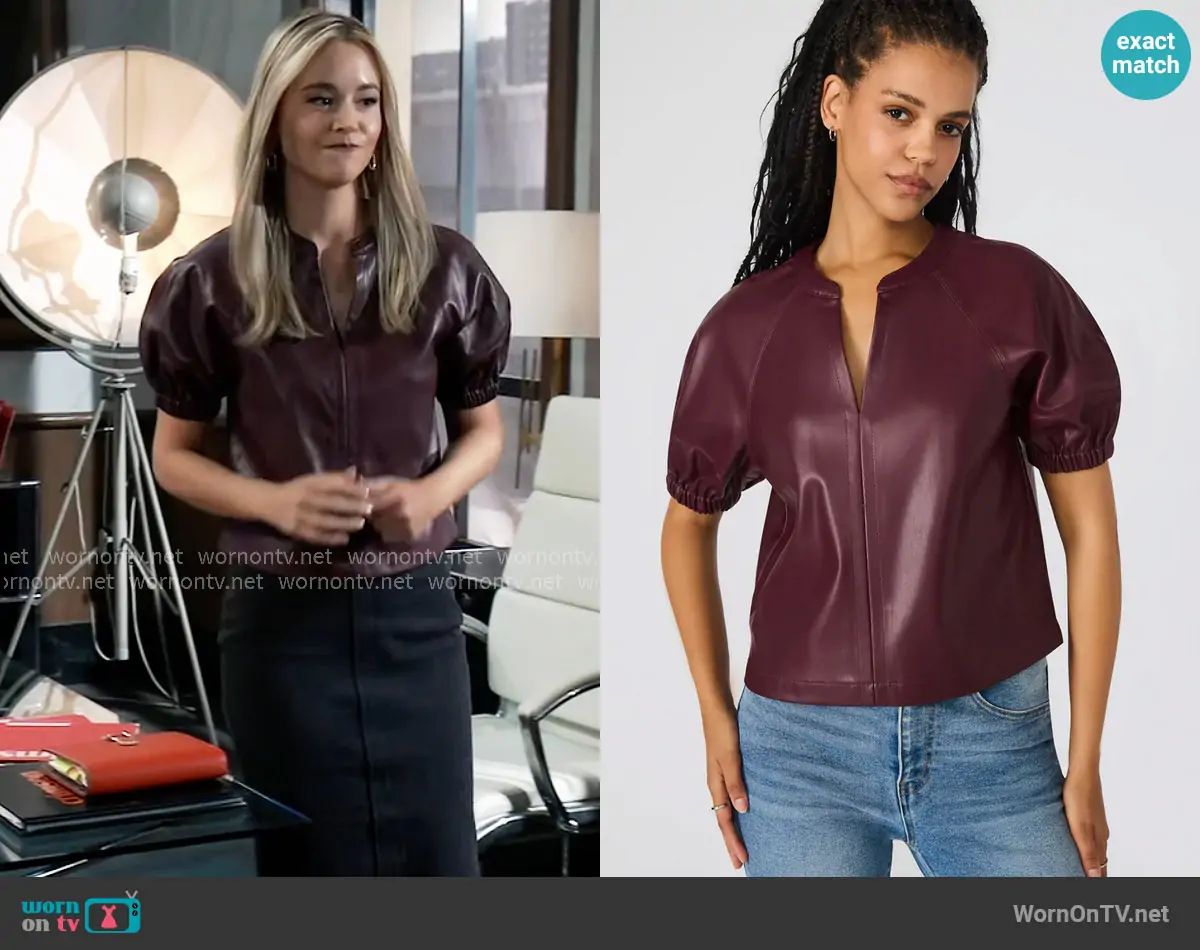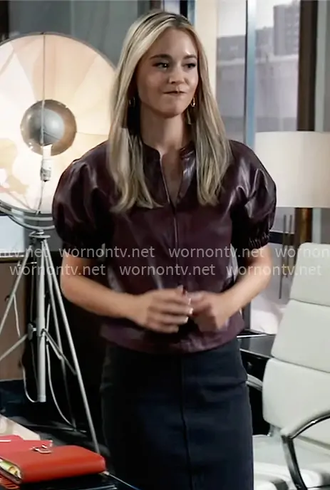 Jacinda Bracken (played by Paige Herschell) on General Hospital on ABC was spotted wearing this burgundy leather top on General Hospital on Dec 11 2025's episode. Jacinda's Top is the Roxanne Top in Wine by Steve Madden .