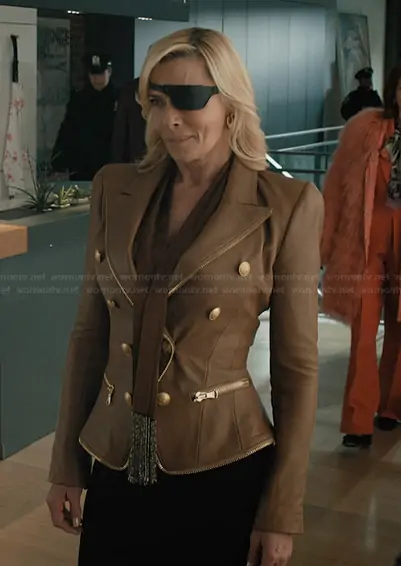 Tiff (played by Jaime Pressly) on Elsbeth on CBS was spotted wearing this brown leather blazer on Elsbeth on episode 'Glamazons' (3x09) in Dec 2025. 's Top is the Kendal Beaded Tie-Neck Silk Blouse by Elie Tahari . 's Blazer is the Ottilie Leather Blazer by L'Agence.