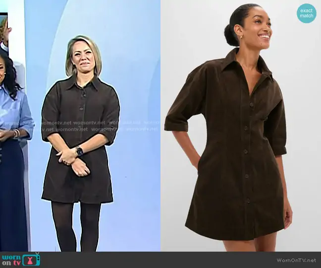 Dylan Dreyer on Today on NBC was spotted wearing this brown corduroy shirtdress on Today on Dec 12 2025's episode. Dylan's Dress is the Carob Luz Mini Dress by Apiece Apart.