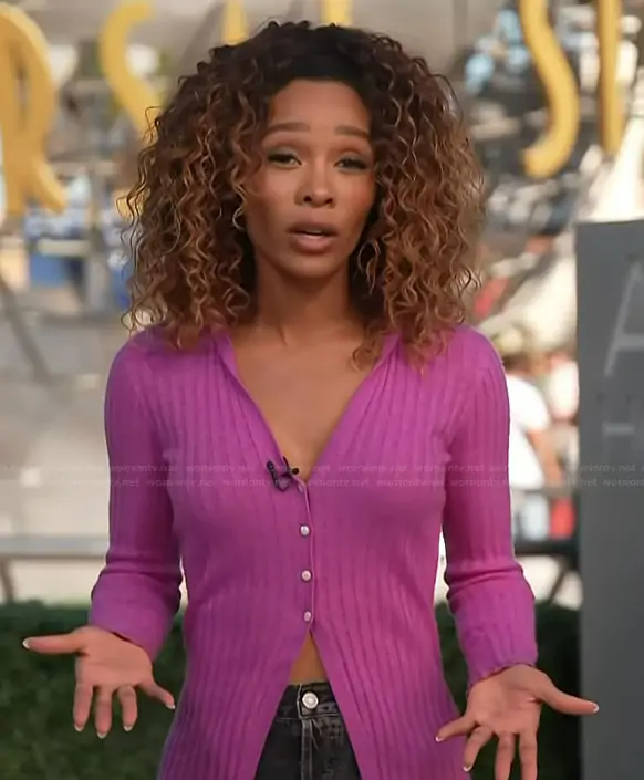 Zuri Hall on Access Hollywood on NBC was spotted wearing this pink cardigan on Access Hollywood on Dec 12 2025's episode. Zuri's Sweater is the Rib Button Cardigan by Guest in Residence.
