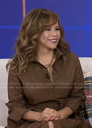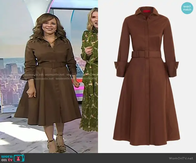 on Today on NBC was spotted wearing this brown belted shirtdress on Today on Dec 15 2025's episode. 's Dress is the Belt-Detailed Taffeta Midi Shirt Dress in Dark Camel by Carolina Herrera . 's Shoes is the Savannah Glow Ankle Strap Platform Sandal by Sam Edelman.