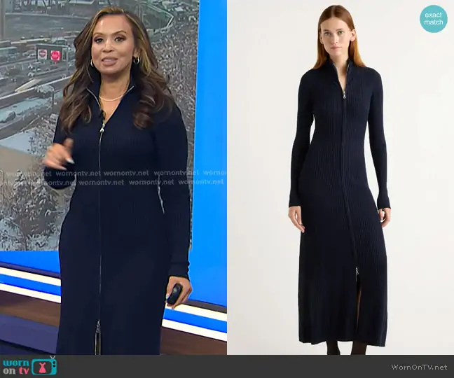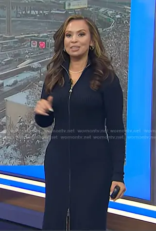 Adelle Caballero on Today on NBC was spotted wearing this navy ribbed zip sweater dress on Today on Dec 15 2025's episode. Adelle's Dress is the Janne Ribbed Two-Way Zip Sweater Dress by Modern Citizen.