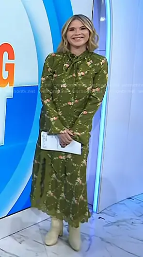 Jenna Bush Hager on Today on NBC was spotted wearing this green floral tie neck blouse and skirt on Today on Dec 15 2025's episode. Jenna's Top is the Sundance Top by Cara Cara