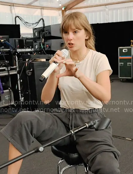 Taylor Swift on The End of an Era on Disney+ was spotted wearing this charcoal grey sweatpants on The End of an Era on episode 'Magic in the Eras' (1x02) in Dec 2025. Taylor's Pants is the Core Straight Leg Sweatpant in Vintage Grey by Elwood .