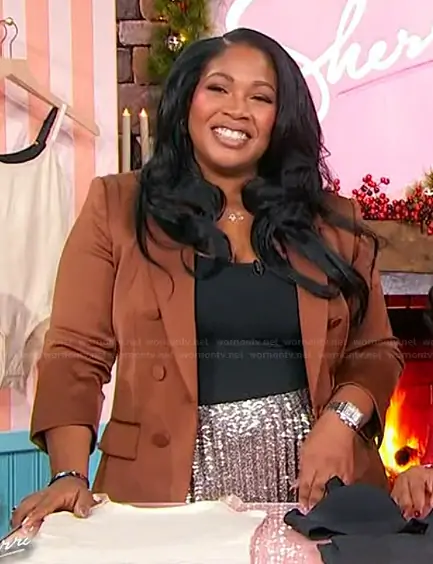 on Sherri on FOX was spotted wearing this Gabrielle Richards’ brown double breasted blazer on Sherri on Dec 16 2025's episode. 's Blazer is the Tomi Double-Breasted Jacket by Veronica Beard . 's Skirt is the Pull-On Pleated Midi Skirt by Anne Klein . 's Shoes is the Anthony Sandal by Sam Edelman.