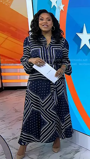 Sheinelle Jones on Today on NBC was spotted wearing this navy geometric print shirtdress on Today on Dec 16 2025's episode. Sheinelle's Dress is the The Hollie Belted Dress in Diamond Rain by Elie Tahari.