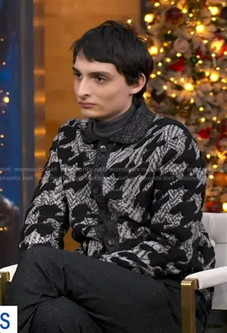 on Good Morning America on ABC was spotted wearing this Finn Wolfhard;s grey houndstooth cardigan on Good Morning America on Dec 16 2025's episode. 's Jacket is the Venosa Houndstooth Jacket by John Varvatos.