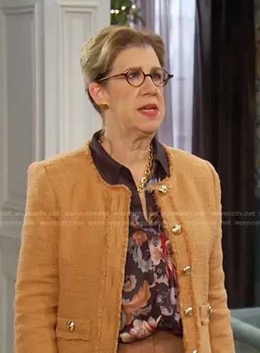 Rita Beacon (played by Maggie Carney) on Days of our Lives on Peacock was spotted wearing this beige tweed jacket on Days of our Lives on Dec 16 2025's episode. 's Top is the The Brielle Relaxed Buttondown Blouse by Anthropologie . 's Jacket is the Christie Tweed Jacket in Sahara by Cinq a Sept.