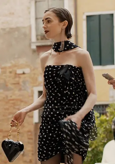 Emily Cooper (played by Lily Collins) on Emily in Paris on Netflix was spotted wearing this black polka dot strapless dress on Emily in Paris on episode 'Veni, Vidi, Venezia' (5x10) in Dec 2025. Emily's Dress is the Polka-dot mini dress by Nina Ricci . Emily's Shoes is the Falene 105 cutout mesh-trimmed suede sandals by Gianvito Rossi . Emily's Earrings is the Chainfall Earrings by Guzema . Emily's Bag is the Heart Bag by GCDS.